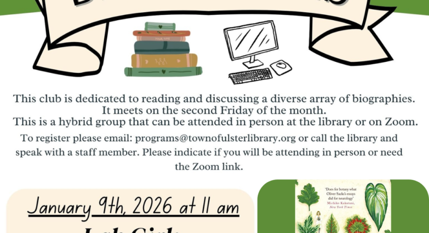 To register please email: programs@townofulsterlibrary.org or call the library and speak with a staff member. Please indicate if you will be attending in person or need the Zoom link.