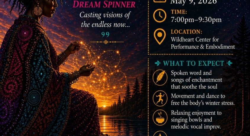 DreamSpinners is a ceremony performance weaving music, dance, and mystical storytelling~ leading audiences into a magical journey. The mesmerizing blend of songs, chants, bone language, storytelling, interpretive dance, singing bowls and percussion invites the audience to experience the emergence of a new timeline. The evening ends with a fire ceremony where new intentions take flame.