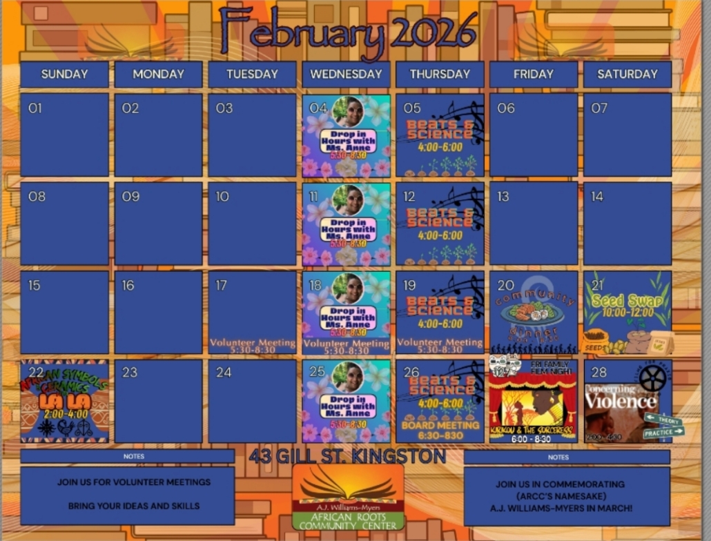 February 2026 event calendarFebruary 1, 2026/in Community /by When Sun, Feb 1, 2026 - Sat, Feb 28, 2026 10:00 am-8:30 pm Add To Calendar Download ICS Google Calendar iCalendar Office 365 Outlook Live Where A.J. Williams-Myers African Roots Center 43 Gill St. , Kingston, NY, 12401 Event Type Community Check out our calendar of events for Feb 2026 made possible by our community’s donations or volunteering. Loading Map.... 43 Gill St. - KingstonEventsFebruary 2026 event calendar - Sun, Feb 1, 2026 - Sat, Feb 28, 2026 - 10:00 am-8:30 pm 41.927037 -73.997361 https://kingstonhappenings.org/wp-content/uploads/2026/02/1000017831.jpg 822 1080 anonymous https://kingstonhappenings.org/wp-content/uploads/2024/06/KH-Transparent-Logo-1-300x157.png anonymous2026-02-13 11:29:252026-02-13 11:29:25February 2026 event calendar