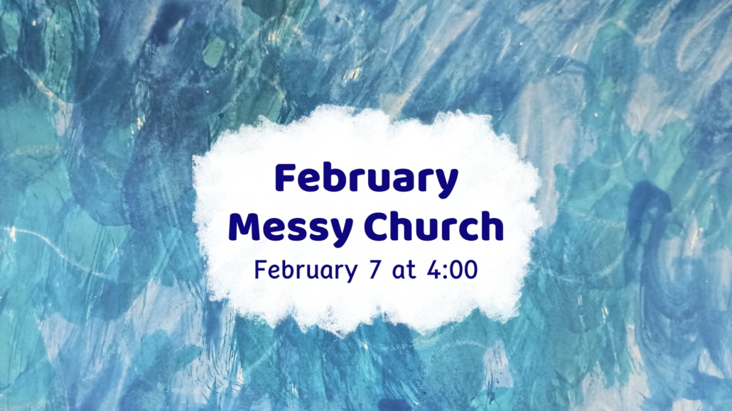 You’re invited to the February Messy Church! Please join us on Saturday, February 7 for crafts, community service projects, storytelling and singing, and a free dinner. This month we will tell the story of Jesus’ baptism, temptation in the desert, and going to his hometown to share his mission of helping the poor. We’ll work on cooperative art projects about baptism and water, the desert, rocks, and temptation, and how the spirit of the Lord helps us help others! Come be part of fellowship, faith, creativity, wiggle-friendly worship, and dinner for all ages.