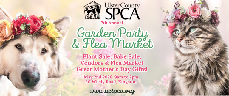 It’s our 17th annual Garden Party & Flea Market! May 2nd, 2026, 9am to 2pm. Come pick out some beautiful blooms to fill your garden, brighten your home, and give as lovely Mother’s Day gifts! Check out all-local vendors including pet products, crafts, and food! No fee for entry. All proceeds from this event benefit the shelter animals at the Ulster County SPCA! For more about our services and events, visit www.ucspca.org