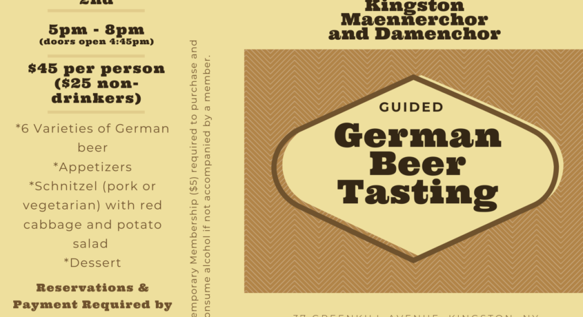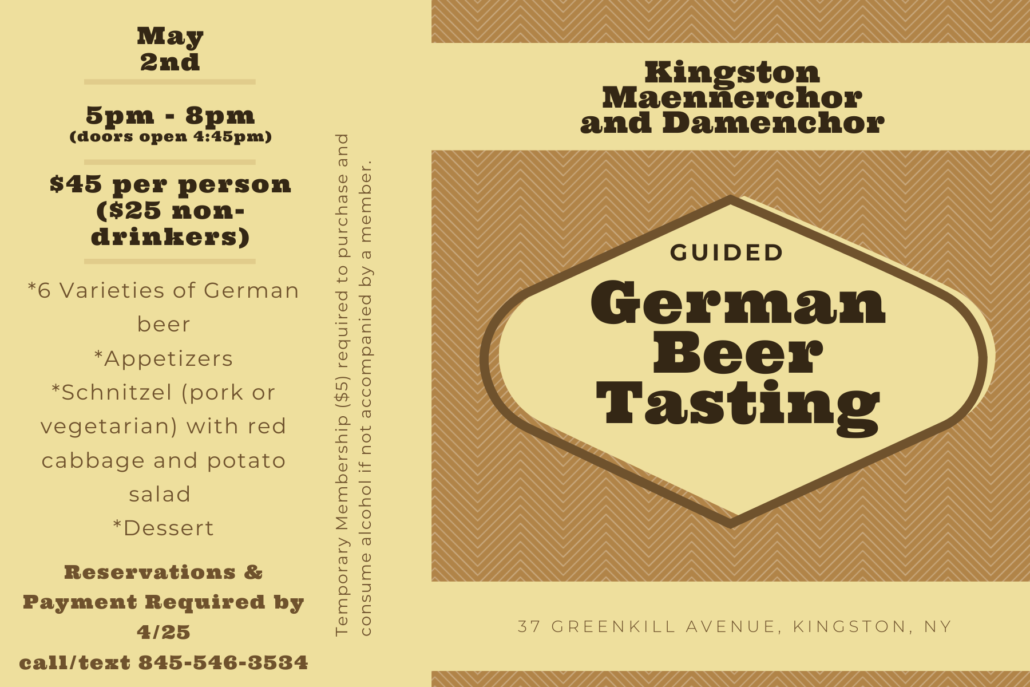Join us for our guided German beer tasting! $45 per person, $25 for non drinkers. Includes appetizers, schnitzel dinner, and dessert. Reservations and payment required by 4/25. Call or text Marian 845-546-3534. See flyer for details!