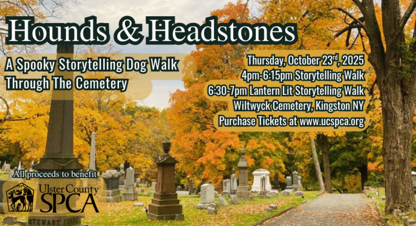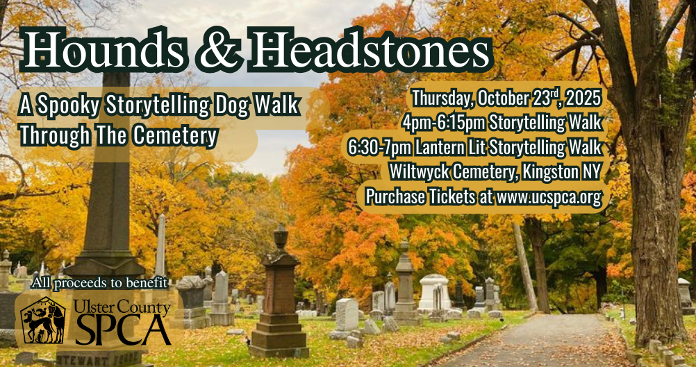 This dog walk and storytelling stroll is hosted on Thursday, October 23rd, 2025 beginning at 4pm at Wiltwyck Cemetery in Kingston, NY. Flashlights will be provided, as well as refreshments. All dogs must come leashed and with proof of rabies vaccination. Attendees must clean up after their dog, so please bring waste bags and be respectful of the cemetery. Tickets are available on our website at www.ucspca.org; 100% percent of the proceeds go towards the care of the shelter animals at the Ulster County SPCA!