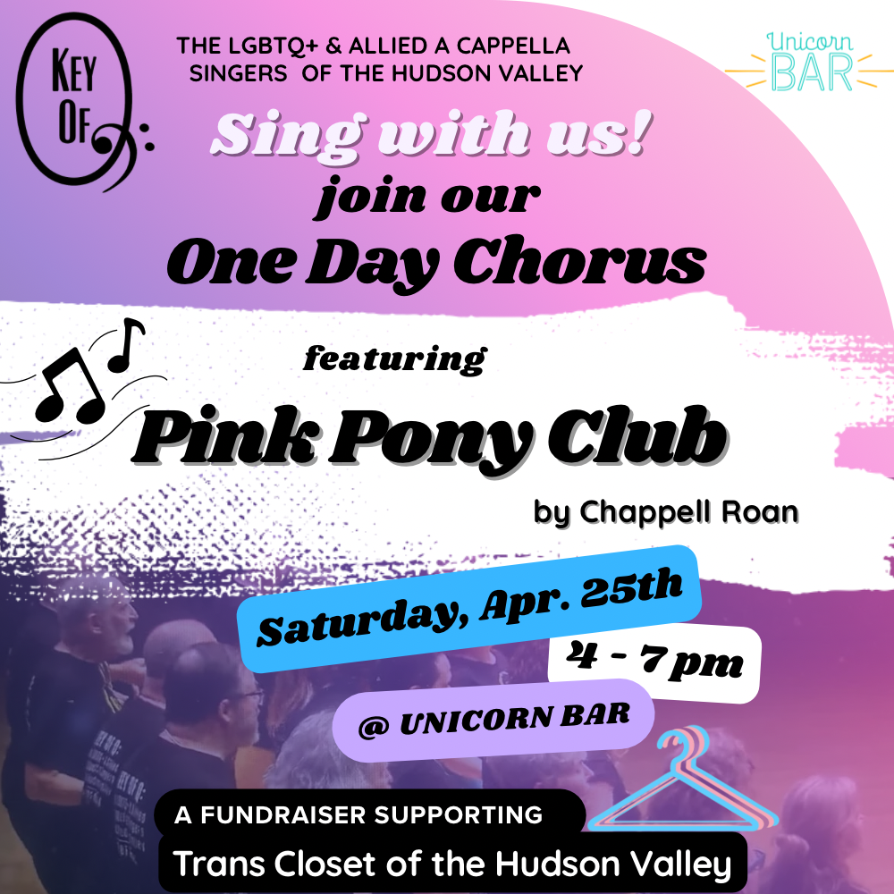 Join Key of Q for its second One Day Chorus. A community event for singers who love to sing and want to be part of it for just one afternoon! This time we’ll be singing “Pink Pony Club” by Chappell Roan. Proceeds will benefit Trans Closet of the Hudson Valley.