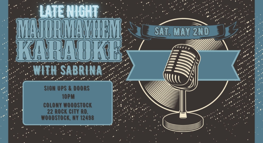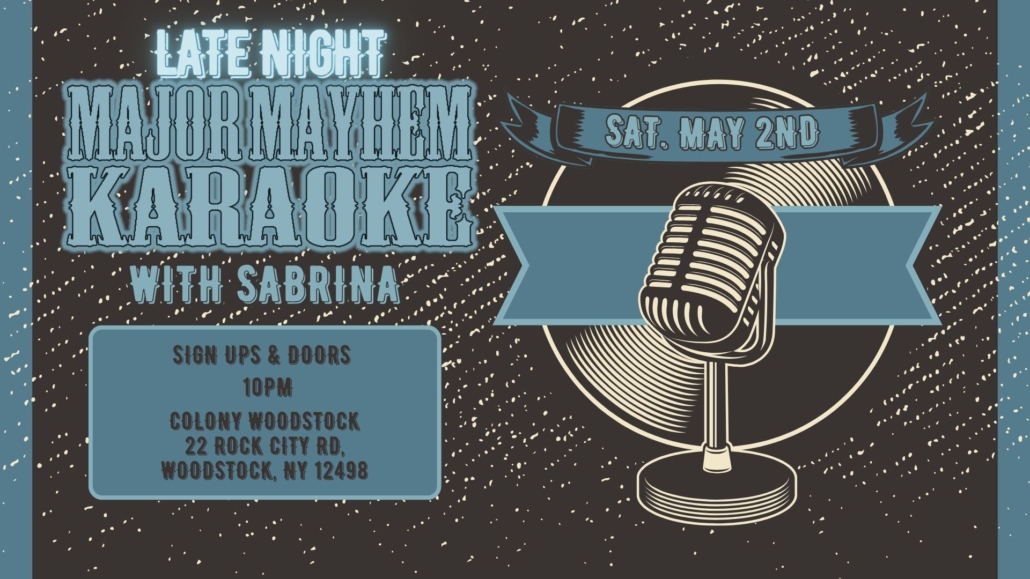 MAJOR MAYHEM KARAOKE with SabrinaMay 2, 2026/in @Featured, @Newsletter, Music, Nightlife and entertainment /by When Sat, May 2, 2026 10:00 pm Add To Calendar Download ICS Google Calendar iCalendar Office 365 Outlook Live Where Colony Woodstock NY 22 Rock City Rd, Woodstock, New York Event Type @Featured @Newsletter Music Nightlife and entertainment Sign ups & Doors 10pm | Start 10:30pm Loading Map.... 22 Rock City Rd - WoodstockEventsDead Last Wednesday' with Gratefully Yours! - Wed, Apr 29, 2026 - 7:00 pmWomen in Music - Thu, Apr 30, 2026 - 7:00 pmJay Collins and the Northern Resistance - Fri, May 1, 2026 - 7:00 pmThe Pink Floyd Project - Sat, May 2, 2026 - 7:00 pmMAJOR MAYHEM KARAOKE with Sabrina - Sat, May 2, 2026 - 10:00 pm 1 2 > 42.0424924 -74.11799489999999 https://kingstonhappenings.org/wp-content/uploads/2026/04/679829064_1623704309555125_1791739980875777895_n.jpg 1080 1920 Kingston Happenings https://kingstonhappenings.org/wp-content/uploads/2024/06/KH-Transparent-Logo-1-300x157.png Kingston Happenings2026-04-27 09:14:462026-04-27 09:14:46MAJOR MAYHEM KARAOKE with Sabrina