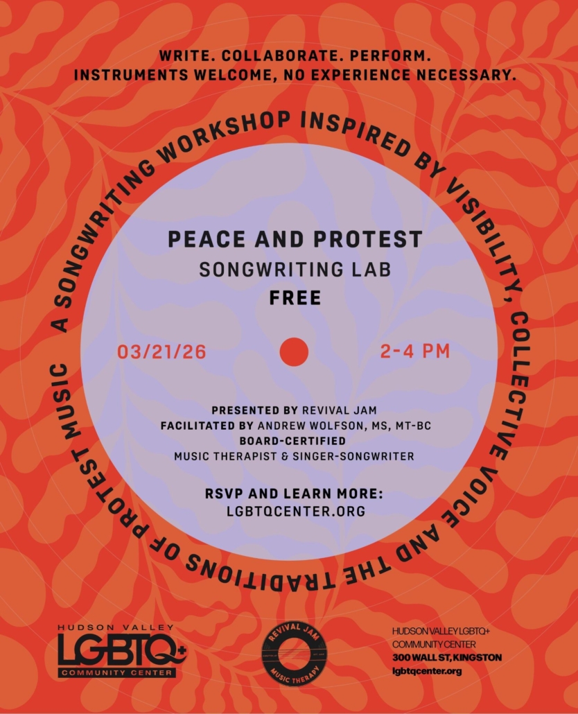 Held at the Hudson Valley LGBTQ+ Community Center in Kingston on March 21 from 2–4 PM. Participants are invited to come together, reflect, and create original songs in a supportive group setting.
