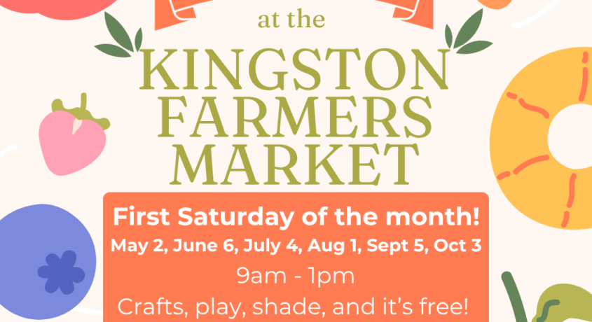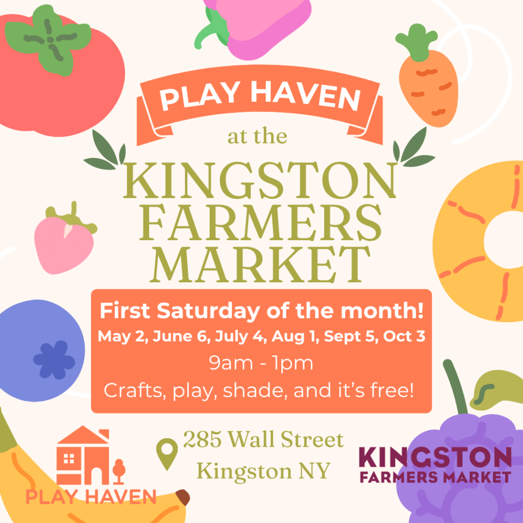 Play Haven is popping up at the Kingston Farmers Market! Enjoy complimentary shade, crafts, playing and fun! First Saturday of each month May – Oct 9am-1pm