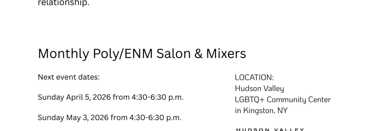 PolyTalk:HV is a monthly salon-style discussion featuring attendee-participation & social mixer for those in the Hudson Valley area who are Polyamorous, ENM-practicing, curious or in any open relationship.