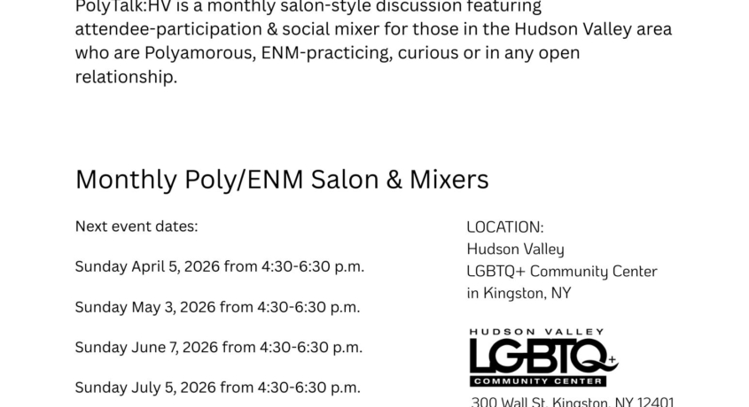 PolyTalk:HV is a monthly salon-style discussion featuring attendee-participation & social mixer for those in the Hudson Valley area who are Polyamorous, ENM-practicing, curious or in any open relationship.