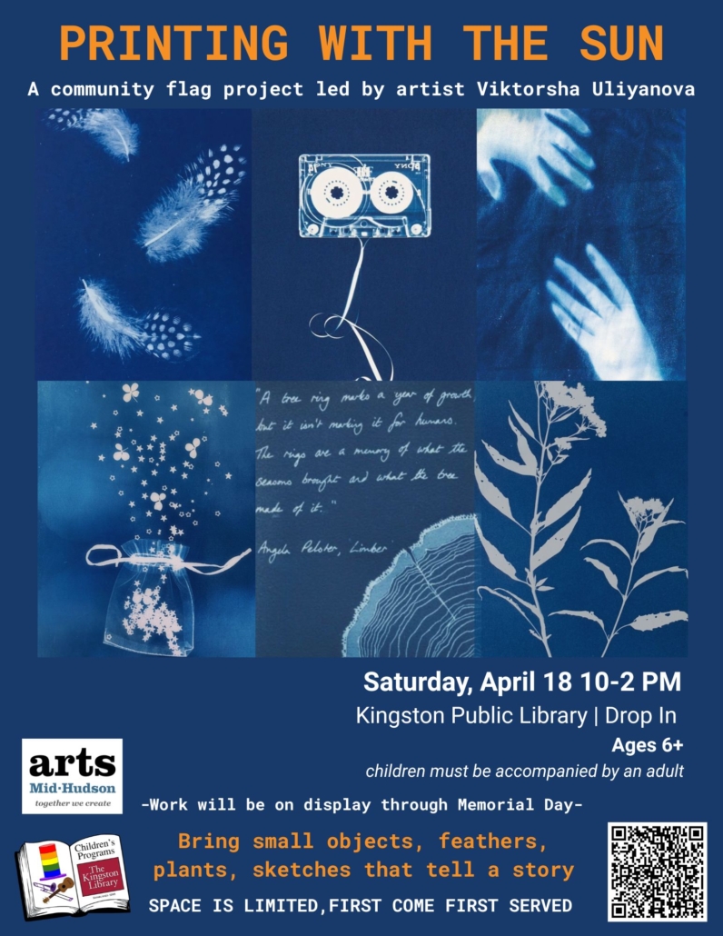 The completed cyanotype fabric “flags” will be displayed in a public installation outside the Kingston Library celebrating the diverse voices of the community. This presentation allows the work to interact with natural elements as they move in the wind, reminiscent of traditional prayer flags. All participants will be credited by name. Concluding the installation, participants will collect their flags as a keepsake of community art-making.