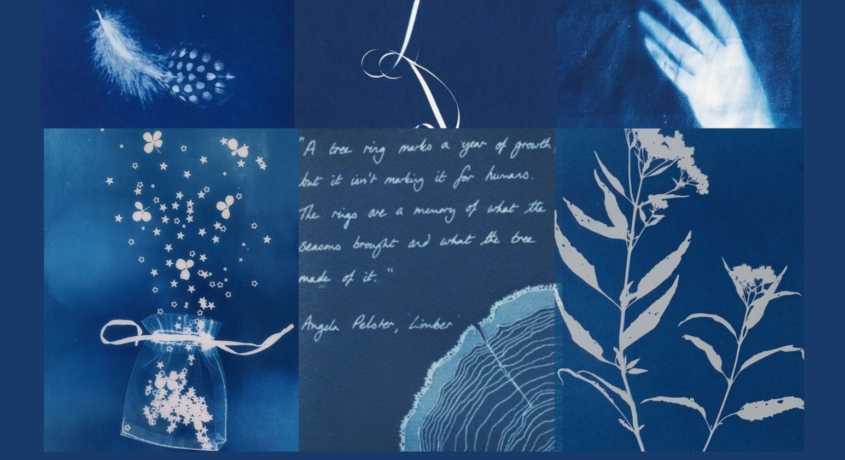 “Woven With Light ” is a collaborative community project with Kingston Public Library that invites participants and local families to learn how to create beautiful handmade fabric prints using camera-less photography. Cyanotype is one of the oldest photographic processes that was developed in 1852. It uses non-toxic chemicals ferric ammonium citrate and potassium ferrocyanide to create a UV sensitive solution which produces vibrant Prussian blue colors. Participants are invited to use plants, small personal objects from home ( smaller than 5×7) , and drawings to compose a photographic image called a photogram.