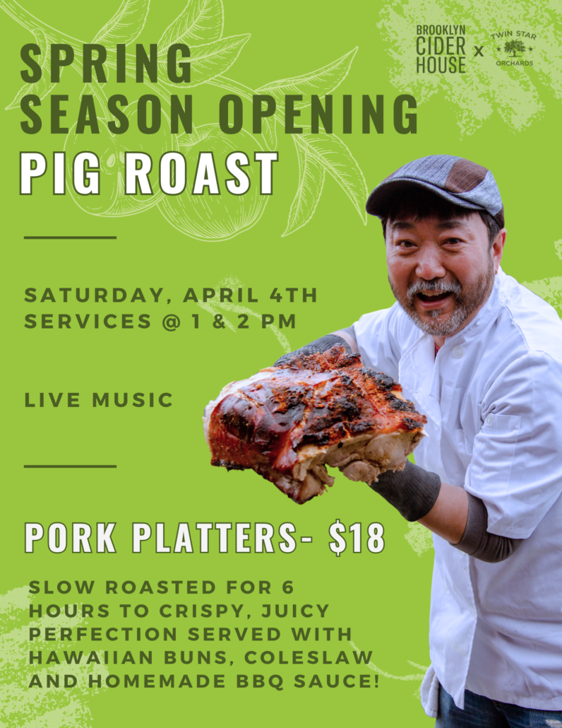 Join us for our annual Season Opening Pig Roast where we’re kicking off the season with a bang by slow-roasting a whole pig in our China Box for 6 hours! Spend the day enjoying tender, delicious pulled pork, crisp cider and live music. With our returning signature wood-fired pizza, burgers hot off the grill, and fresh salad and sides, there’s sure to be something for everyone!