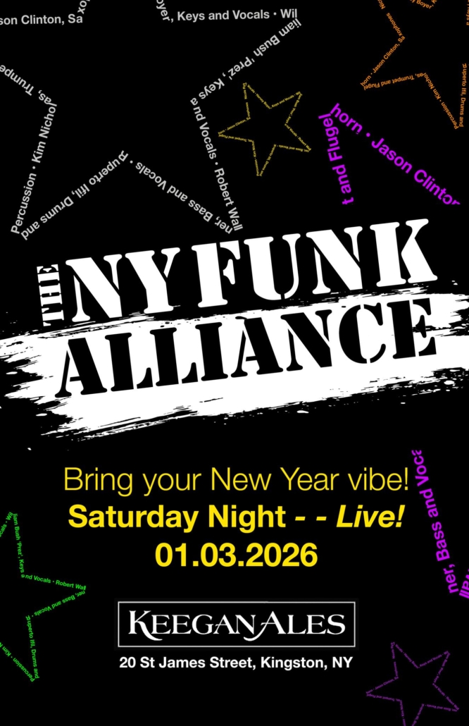 8 Piece powerhouse band ‘The New York Funk Alliance’ will usher in the first weekend of 2026 at Keegan Ales in Kingston, NY. If you love funk, soul, r&b, and dancing, this is for you!