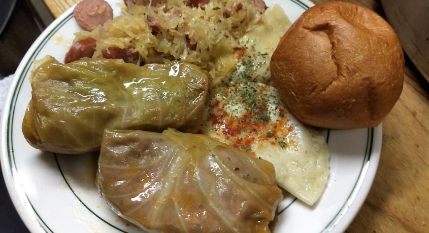 Dinner will consist of Stuffed Cabbage, Pierogi, Kielbasa with Sauerkraut, Roll with Butter and Dessert.