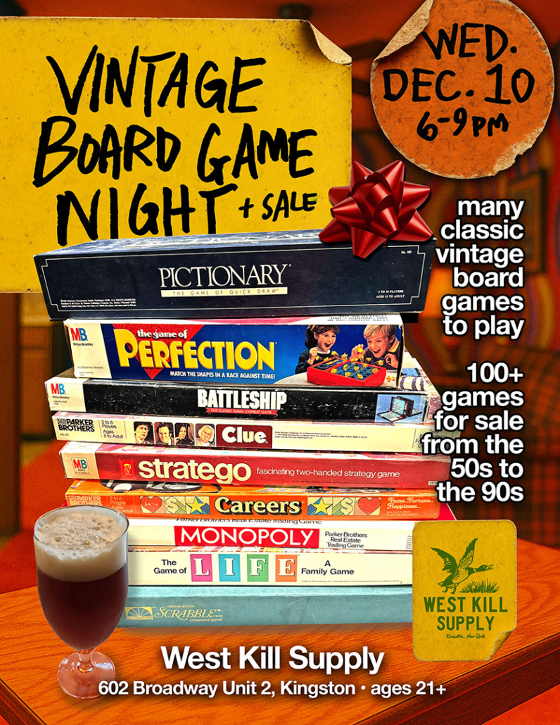 This one-night-only pop-up event offers a chance to revisit the classic charm of vintage board games, with around 100 titles from the 1950s through the 1990s available for purchase. A selection of games will also be on hand for attendees to play at West Kill’s tabletops. The collection spans a range of well-known favorites and lesser-known gems.
